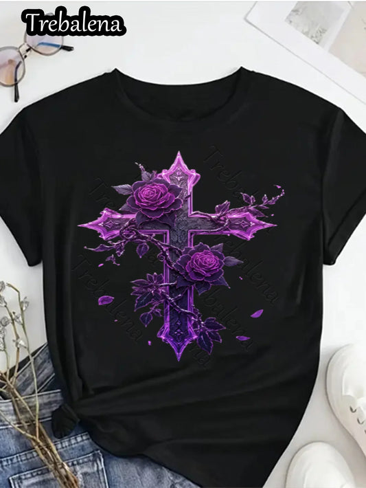 Trebalena Round Neck T-shirt 100% Cotton Purple Rose Cross Gothic Style Plus Size Women T Shirt Vintage Graphic Tee For Ladies
