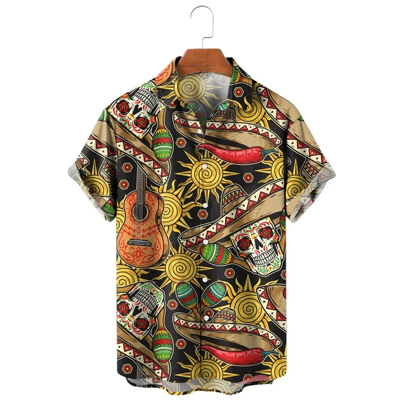 Punk Straw Hat Skull Graphic Shirts For Men Clothing Casual Hawaiian Vacation Short Sleeve Fashion Mens Beach Shirts Y2k Tops
